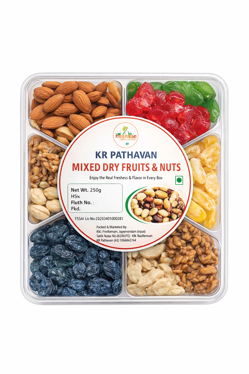 Experience the perfect balance of taste, nutrition, and freshness with KR Pathavan Premium Mixed Dry Fruits. Carefully curated and hygienically packed, this 250 g square box contains a rich assortment of premium quality nuts and dried fruits — ideal for daily snacking and special occasions.